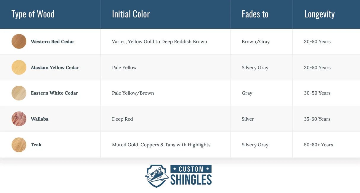 The type of wood determines the initial color and how it will transform over many years. Custom Shingles offers the following cedar and hardwood roofing products: